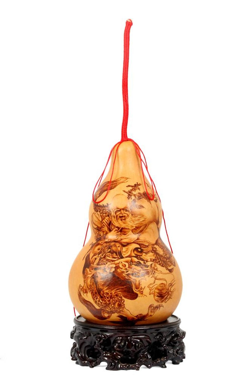 葫芦烙画艺术又称烫画,火笔画,即艺术家用电烙铁在物体上熨出烙痕作画,与葫芦融为一体能永久保存、收藏,艺术价值极高。烙画创作在把握火候、力度的同时,注重“意在笔先、落笔成形”。烙画不仅有中国画的勾、勒、点、染、擦、白描等手法,还可以熨出丰富的层次与色调,具有较强的立体感,酷似棕色素描和石版画,因此烙画既能保持中国传统绘画的民族风格,又可达到西洋画严谨的写实效果。也可订做属于自己的特有画面或肖像,使其有独特的艺术魅力,因而给人以古朴典雅、回味无穷的艺术享受。